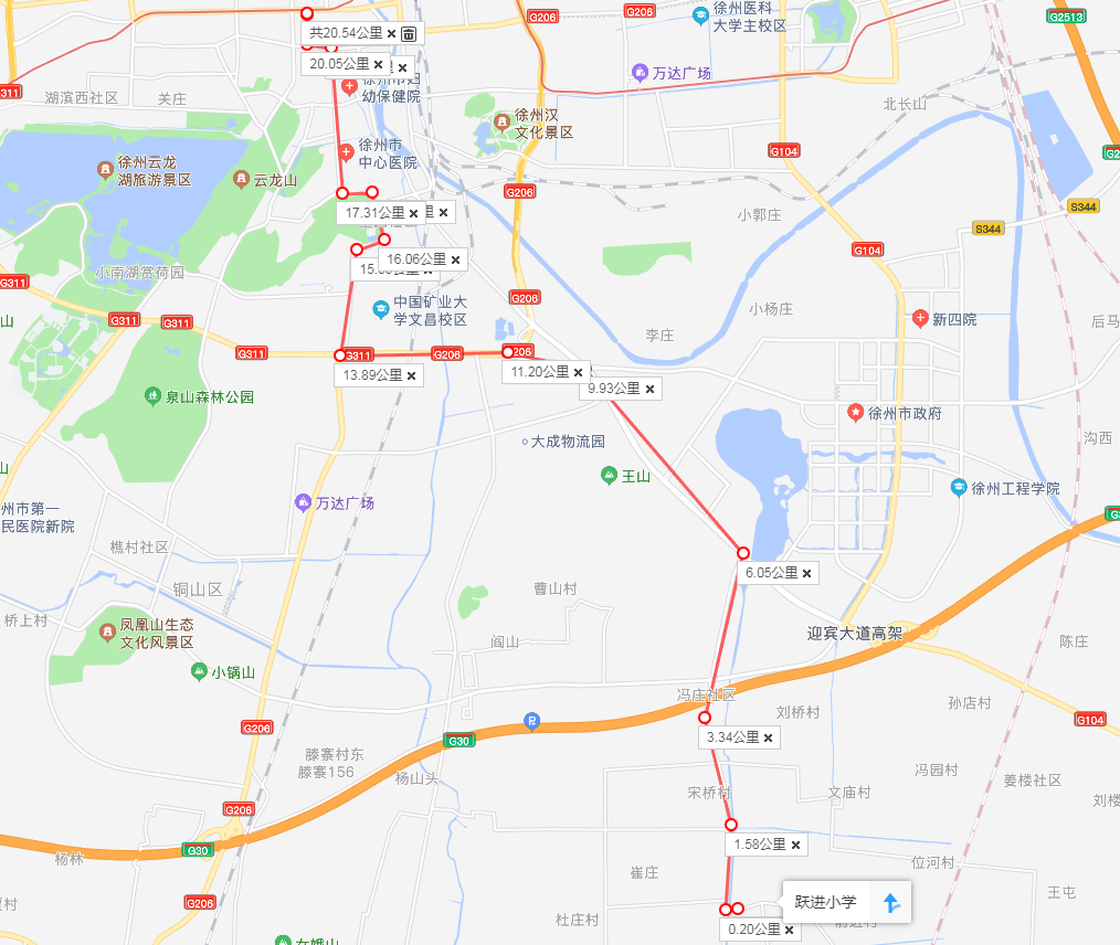 (1)線路走向:204縣道-溝棠路-周定路-迎賓快速路-御景路-三環(huán)南路-解放南路-解放路-建國(guó)東路-彭城路。
