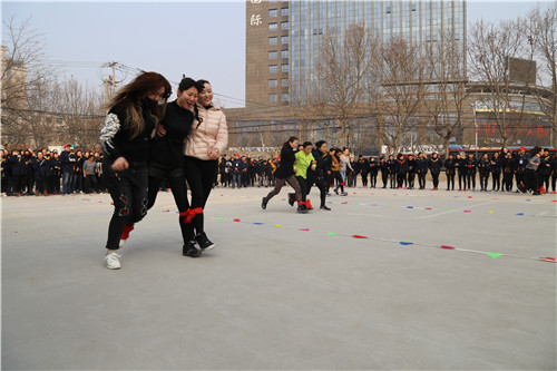 “參賽隊(duì)員各就各位!裁判員準(zhǔn)備計(jì)時(shí)!”運(yùn)動(dòng)會(huì)主持人一聲令下,首先開始比拼的項(xiàng)目是需要隊(duì)員齊心協(xié)力,發(fā)揚(yáng)合作精神的“三人四足接力賽”,三人一組紅繩綁腿齊步走,每隊(duì)12名參賽隊(duì)員,比的是速度,更是勁兒往一處使的同心合力?!凹佑停〖佑桶。 薄耙欢?!一二!”比賽場(chǎng)上運(yùn)動(dòng)員的號(hào)子聲和場(chǎng)外女工們的加油聲、歡笑聲交織一起,此起彼伏。