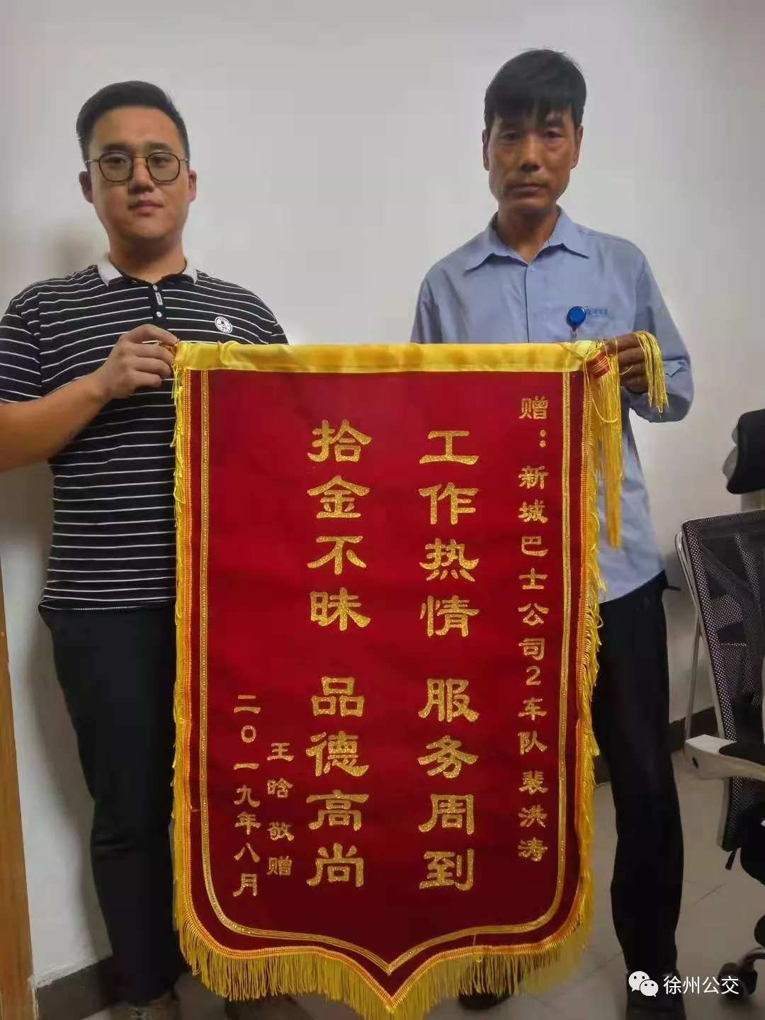 幾天后,失主王先生帶著錦旗專門來到車隊(duì)感謝裴師傅,因?yàn)槭謾C(jī)里有很多重要的工作資料,沒有備份,發(fā)現(xiàn)手機(jī)丟了,他急壞了。他在站臺(tái)一輛車一輛車的詢問,幸好手機(jī)被細(xì)心的裴師傅撿到了,他懸著的一顆心才算放了下來。王先生對(duì)公交駕駛員拾金不昧的高尚品德進(jìn)行了贊揚(yáng)。