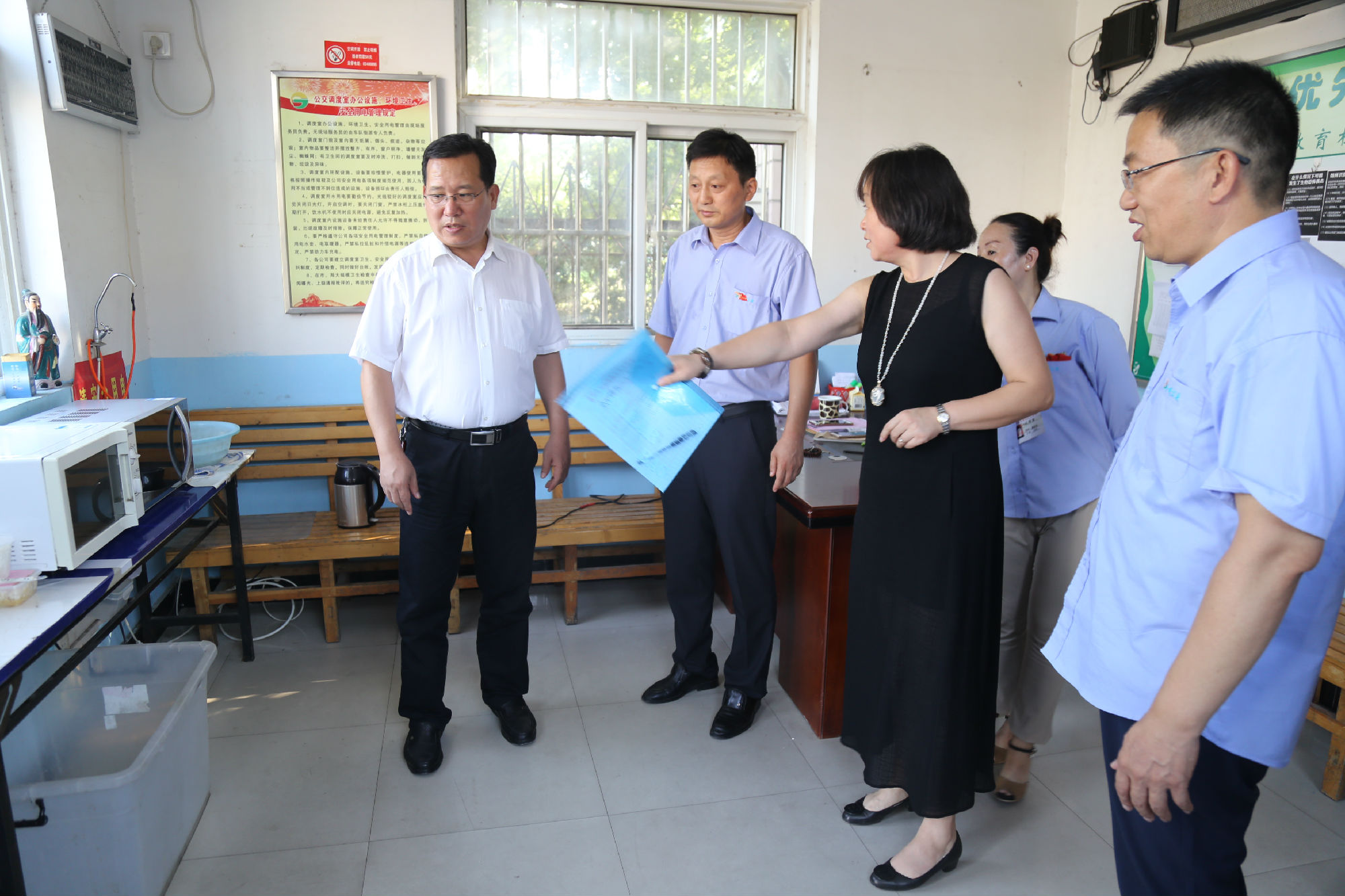 接著,劉洪印走進調(diào)度室,察看了調(diào)度室的工作環(huán)境和降溫措施,關(guān)切地詳細(xì)詢問了駕駛員的生產(chǎn)生活、用餐休息等情況,并對公交設(shè)置愛心驛站,關(guān)心關(guān)愛乘客和環(huán)衛(wèi)等室外工作者給予了高度評價。