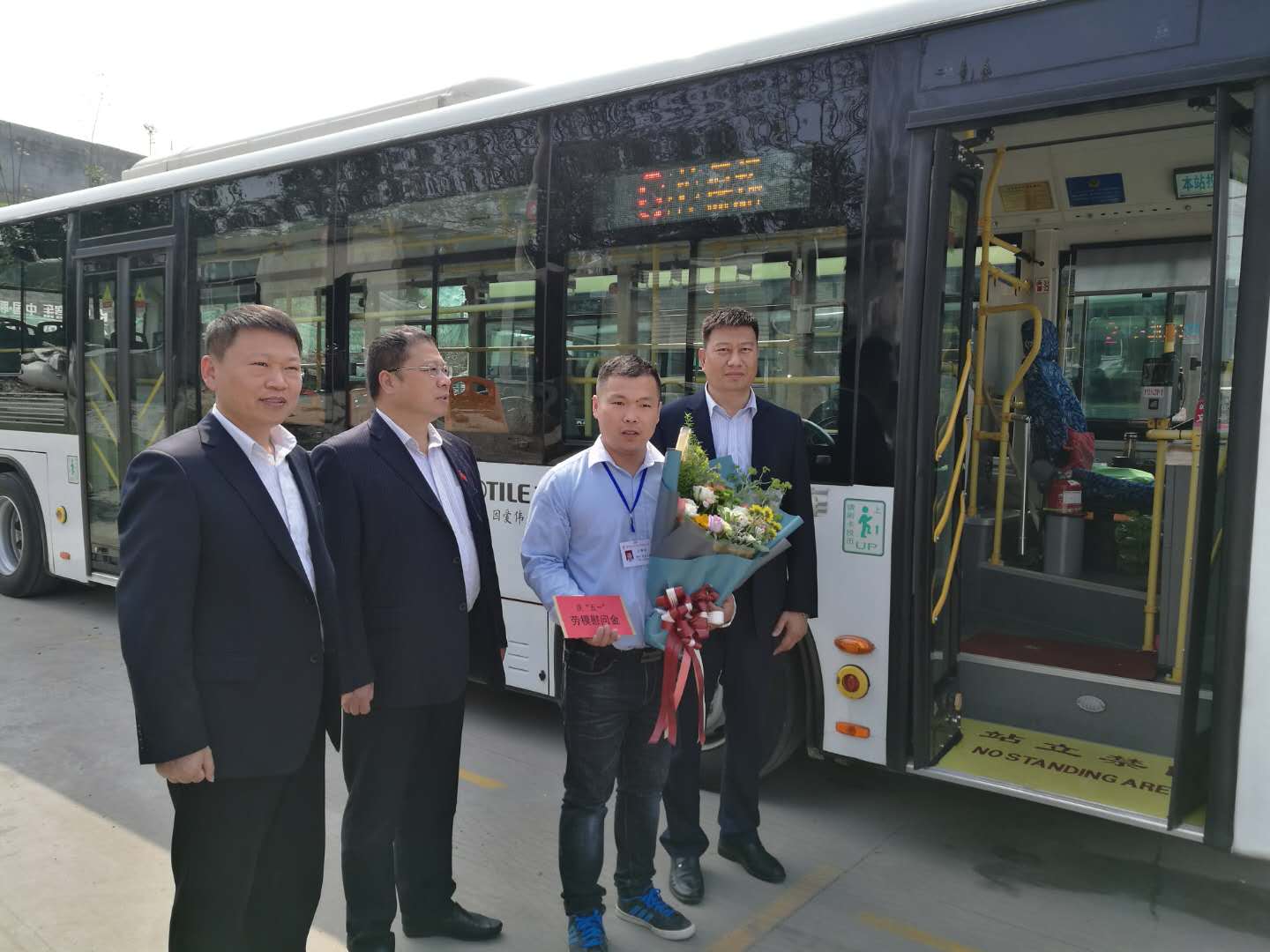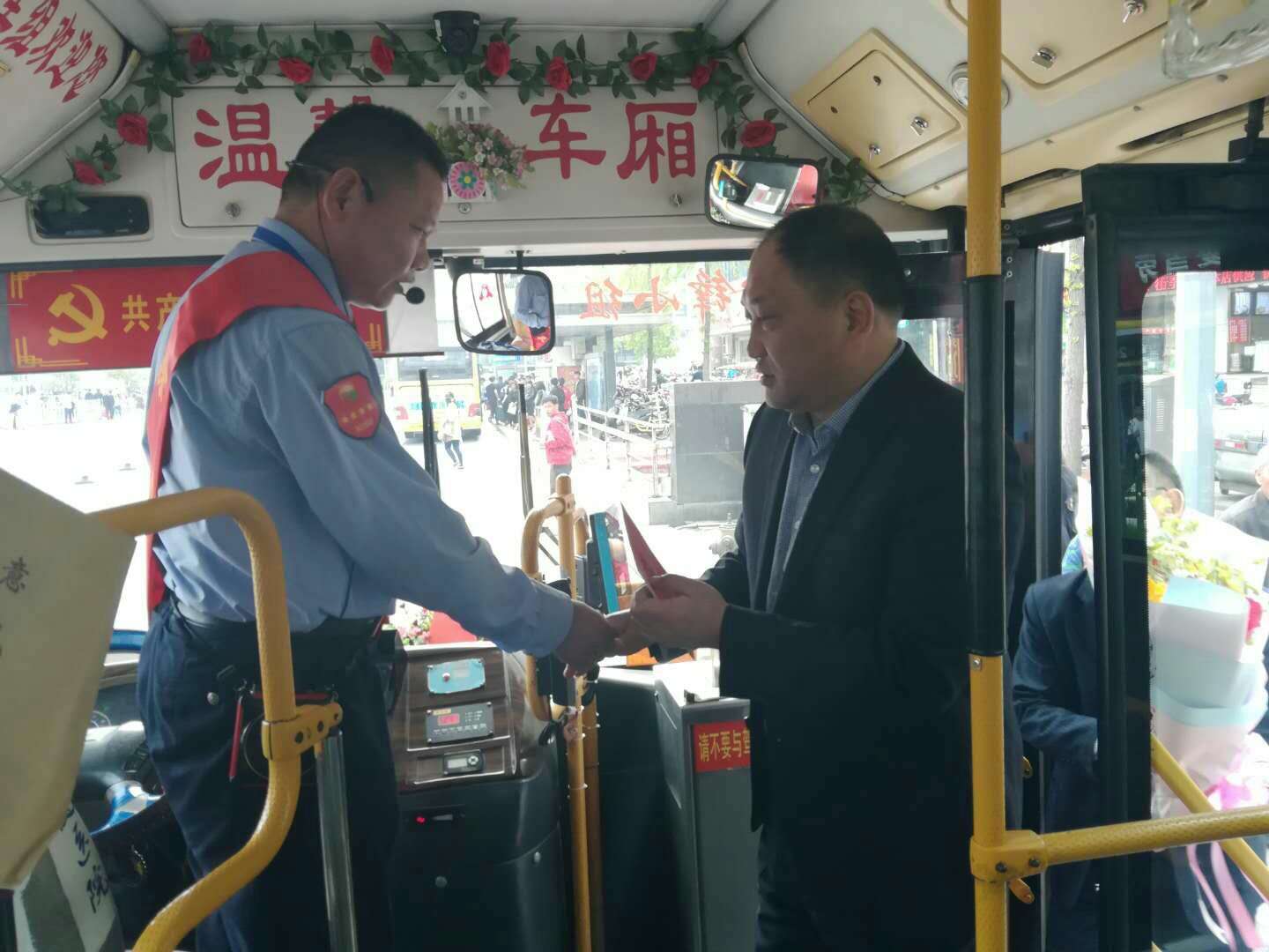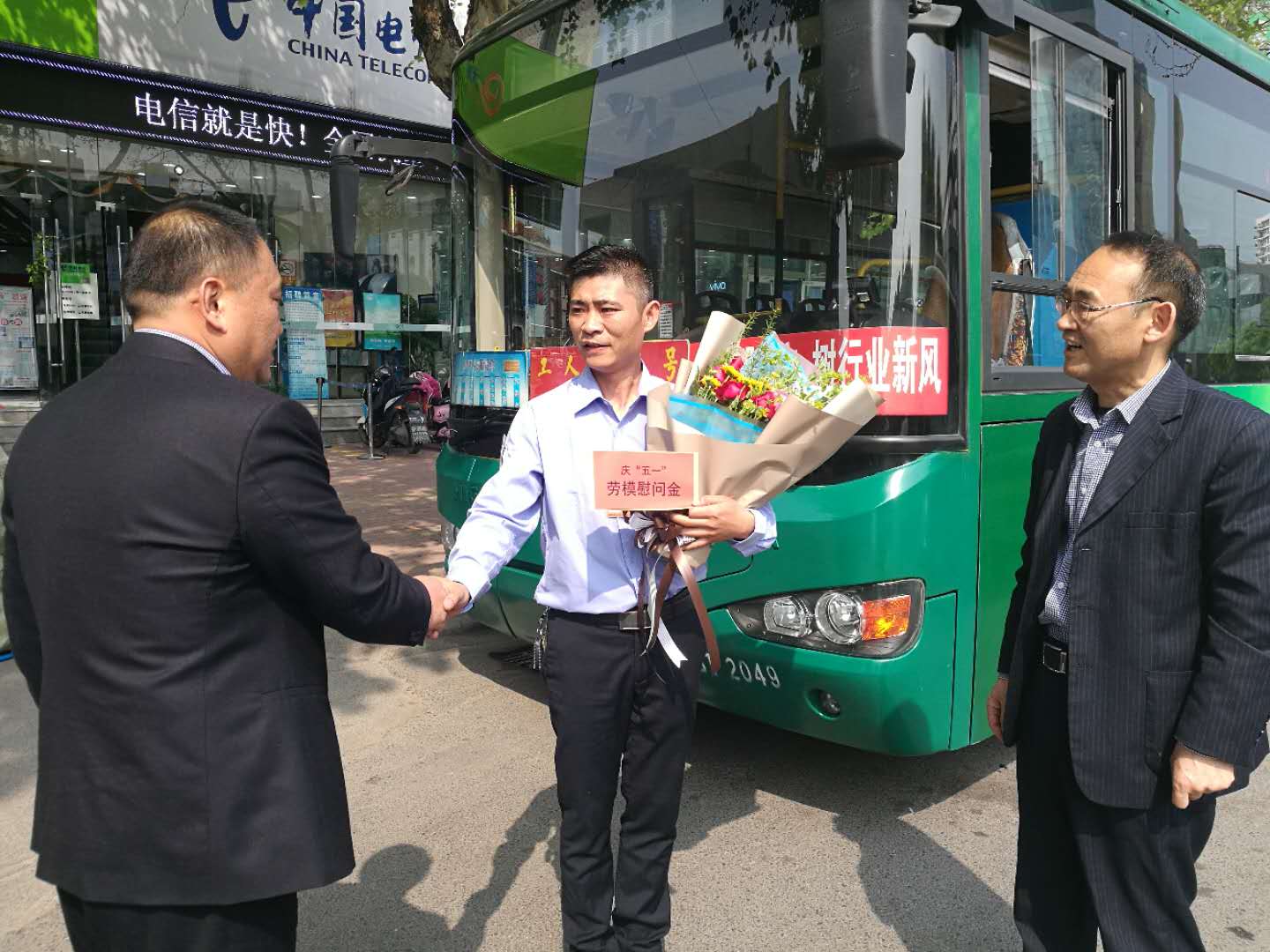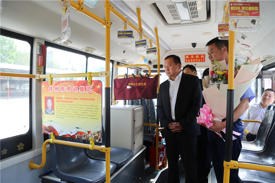 杜紅軍一行首先來(lái)到韓山終點(diǎn)站,剛行駛完一趟的市勞模、49路線駕駛員王博正利用休停時(shí)間打掃車輛,杜總走上前親切地與王博握手,并把一束嬌艷芬芳的鮮花和勞模慰問(wèn)金送到他手中。